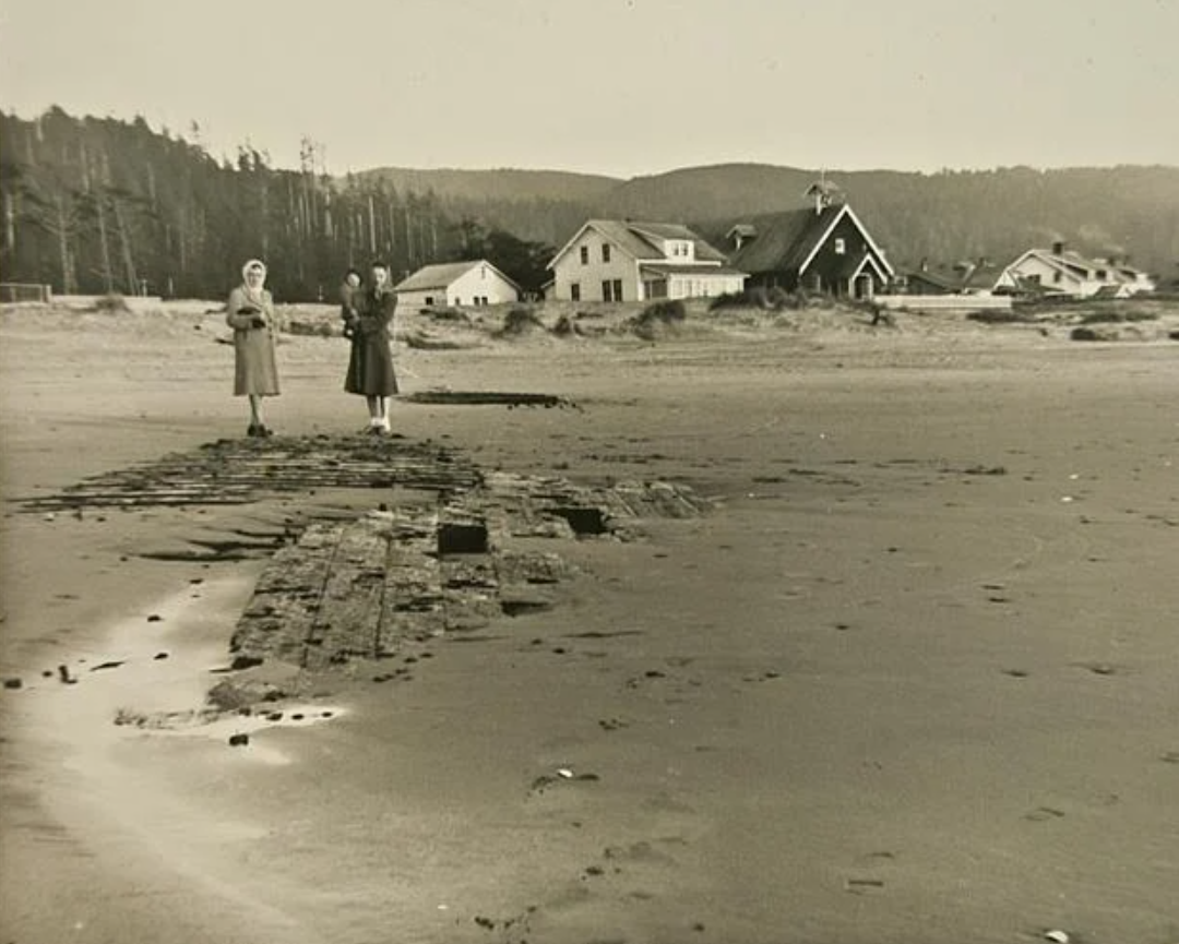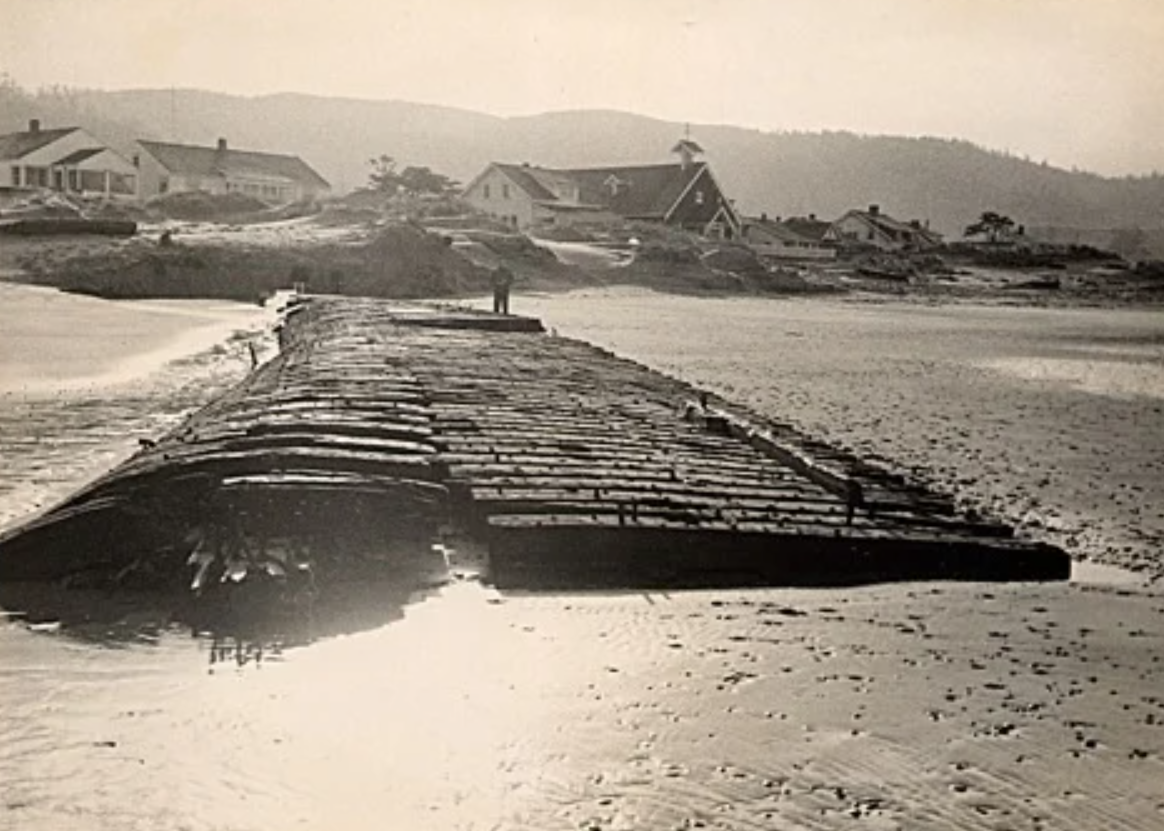 In January 1954, a fierce coastal storm tore away enough sand to reveal something long buried: the bones of the Emily Reed, a sailing ship, wrecked offshore in 1908. With the help of a bulldozer, the fire department uncovered part of its wooden skeleton directly in front of the church.